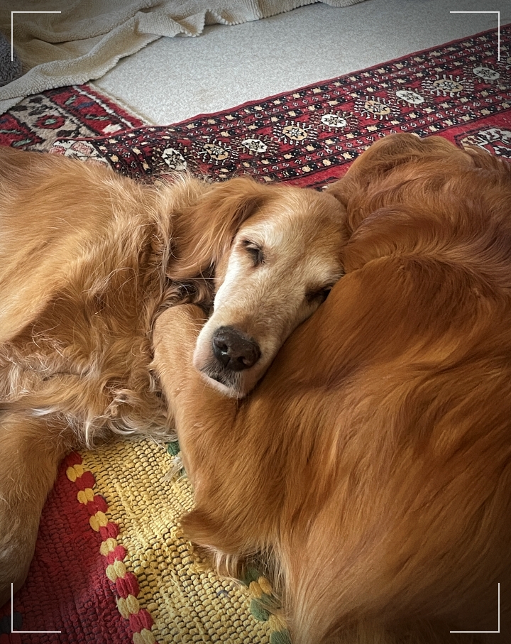 Das Foto ist hier zu Hause aufgenommen. Sie genießt die Spaziergänge mit ihren Kumpels und gelegentlich lässt sie sich von deren Tempo anstecken. So sehr ich mich über diese dollen fünf Minuten freue, um so mehr freue ich mich, dass Fiene und Mac immer öfter zusammenliegen. Während sie schläft, legt er sich zu ihr, fast als würde er auf sie aufpassen. Und sie kuschelt sich dann an ihn ran.