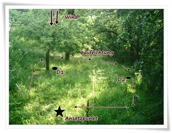 Da ich keinen Helfer hatte, habe ich Delphin am Ansatzpunkt abgesetzt, und bin um das Suchengebiet herumgelaufen. Alle paar Meter habe ich mich hingehockt oder ein Geräusch gemacht ohne dabei ein Dummy abzulegen. Nur an den markierten Stellen lag dann zum Schluß ein Dummy.