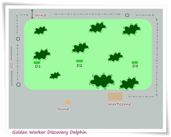 Der Aufbau wie in Übung 2 allerdings wurde die Maus zwei Mal von mir in das Suchengebiet geschickt. Wieder holte sie D2 als erstes, das zweite Dummy, dass sie mir brachte war D3.