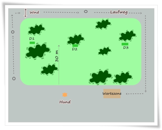 Zu Beginn eine Wiederholung der letzten Übung. Drei Dummys wurden in einer Tiefe von ca. 20 Metern und einem Abstand von ca. 10 Metern ausgelegt. Wir arbeiten mit Gegenwind.