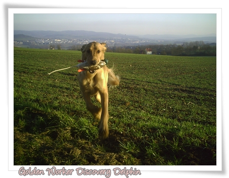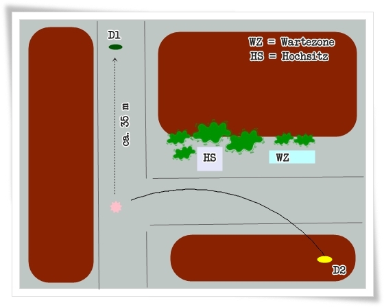 Zum Abschluss wollt ich die Übung dann nochmal umdrehen. Ich habe Fienchen wieder am Startpunkt abgesetzt und das Dummy bei D1 ausgelegt. Danach haben wir uns erneut um 90° gedreht und ich habe ihre Verleitung (jetzt Markierung) geworfen. Nach den Werfen habe ich leise gezählt 21…..22…..23…..24….. „fetch it“