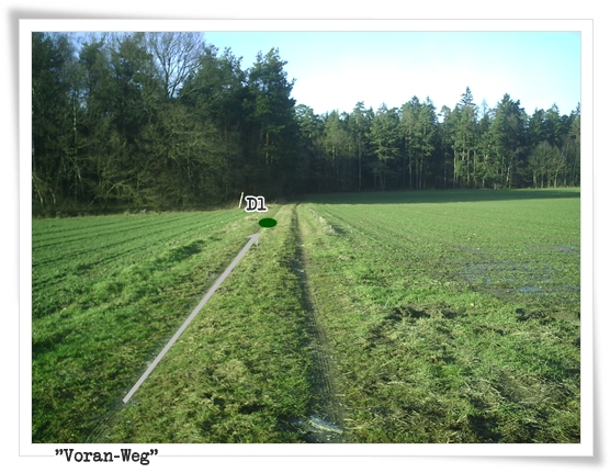 Wir gehen gemeinsam (sie frei bei Fuß) zu D1 und legen das Dummy aus. Zurück am Startpunkt drehen wir uns um 90° und ich werfe die Verleitung auf den Acker. (sie war seeeehhr hibbelig). Dann habe ich sie zurückgedreht und bin mit ihr drei Schritte auf D1 zu gelaufen.