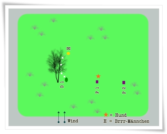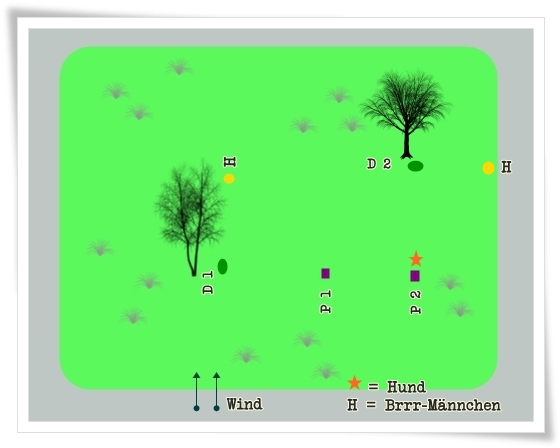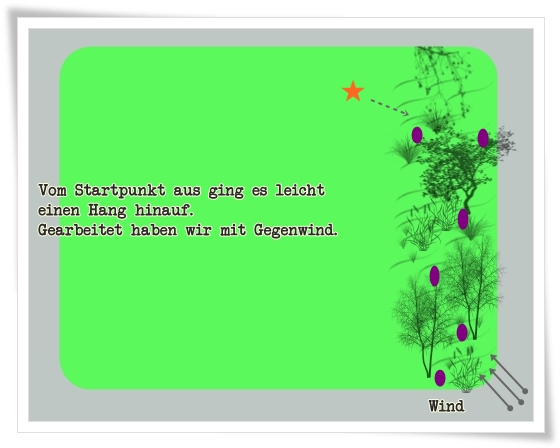 Fiene wurde in Blickrichtung zu D1 gesetzt. Das Mark wurde geworfen, danach haben wir uns um 90° gedreht und die zweite Markierung an dem „neuen“ Fixpunkt ausgeworfen. Da sie da ja noch nicht hingelaufen war wurde für dieses Mark ein Flagman genommen.