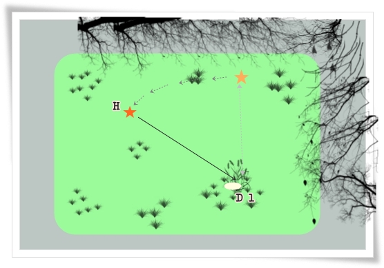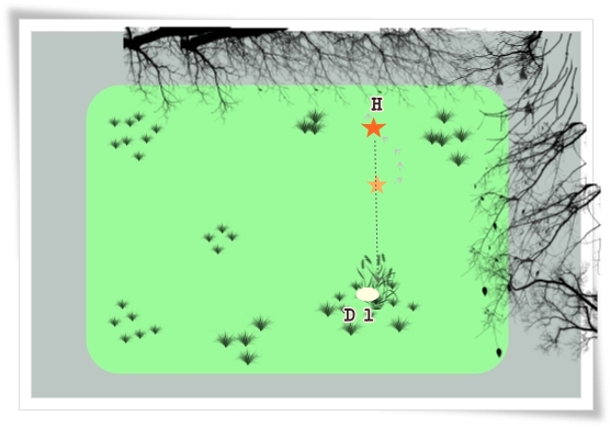 Fienchen blieb am Startpunkt sitzen und ich gehe in einer geraden Linie zu unserem Fixpunkt. Wieder sieht sie, wie das Dummy ausgelegt wird. Zurück bei ihr drehen wir uns um 180° und gehen zu unserem neuen Startpunkt.
