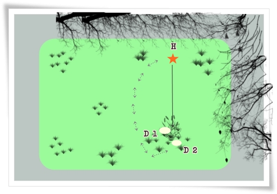 Vom Startpunkt aus gehen wir gemeinsam zum Grasbüschel und Delphin sieht zu, wie ich das Dummy dort platziere. Dann gehts zurück zum Startpunkt. Einweiseritual „get out“
