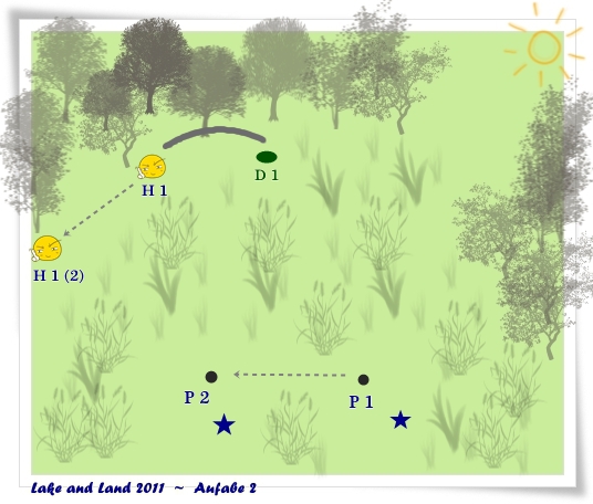 - Ein Einzel-Walk up zu P1. Es fällt ein Schuß und die Markierung D1. Danach weiter frei bei Fuß zu P2. In der Zwischenzeit wechselt auch der Helfer seine Position nach H1 (2). Nach Freigabe ist der Hund auf die Markierung zu schicken