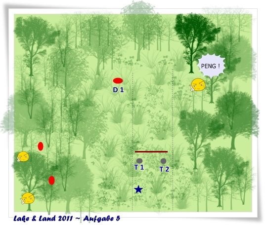 - Gelände: Ein Waldweg und der Wald links oberhalb der Startpunkte (T1 und T2)