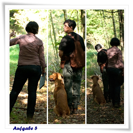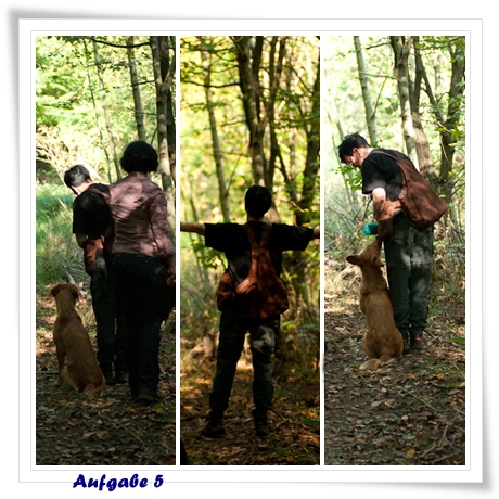 Gut, das schien ja durchaus lösbar. Nichts, was wir nicht im Training schon gemacht hätten. Leider kommt es manchmal anders als man denkt. Da in unserem Gelände zwei Aufgaben gerichtet wurden mussten die Teams für die Aufgabe 3 „durch“ unsere Aufgabe laufen. Als Fiene und ich bei der Richterin standen liefen also zwei Teams hinter uns lang um dann „zischen den Bäumen in Richtung der Sonne auf dem oberen Bild) zu verschwinden. Diese Aktivität fand Fiene extrem interessant. Fiene guckte immer noch hinter dem anderen Team her als der Schuß fiel. Ich schielte zu ihr runter und im letzten Moment zeigt ich mit der rechten Hand in Richtung der fallenden Markierung. Ich hoffte, dass sie diese noch gesehen hatte.