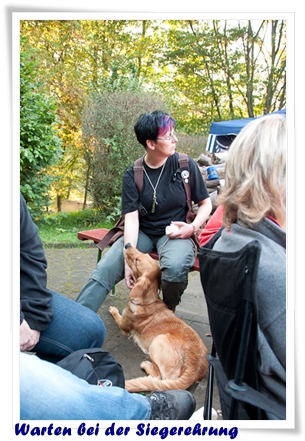 Also die Wartezeit bis zu dieser Aufgabe waren über 1,5 Stunden. Ich ging also mit der Süßen vor unserem Start ein wenig umher und versuchte sie davon zu überzeugen … dass sie Pipi muss. Sie guckte mich an mit einem Blick … „Neee, ich muss nicht!“ und so machten wir uns bereit. Der Richter erklärte die Aufgabe und ich fragte nochmal nach. „Sie soll nicht verloren suchen sondern eine kleine Suche machen?“ „Ja!“ Es ging los. Sie beobachtete aufmerksam die Markierung und dann gings frei bei Fuß zu diesem Graben. Ich ließ sie absitzen, ging vor ihrer Nase langsam mit der Hand Richtung Boden und machte den Suchenpfiff. Sie fing an zu schnuppern und hüpfte über den Graben. Stop-Pfiff und mit der Hand wieder zur Erde gezeigt …Suchenpfiff. Rein in den Graben und zack … gefunden. Und wieder reingeschickt… Da war doch noch was… Ach ja, PIPIMACHEN!!! GRRRRR!!! Nachdem sie erst mal in das Suchengebiet gepieselt hatte suchte sie weiter, fand und wir gingen zu P2. Nun machte Frauchen einen entscheidenden Fehler. Da es sich ja um eine Memorie handelte wollte ich sie mit voran schicken. Leider habe ich sie zu kurz konzentriert und sie blieb nach 2 Sprüngen stehen 😦 Ich rief sie zurück, nahm Aufstellung für einen Richtungsapport und schwupp hats geklappt. Aufgabe beendet, ich nicht zufrieden. Das können wir besser!