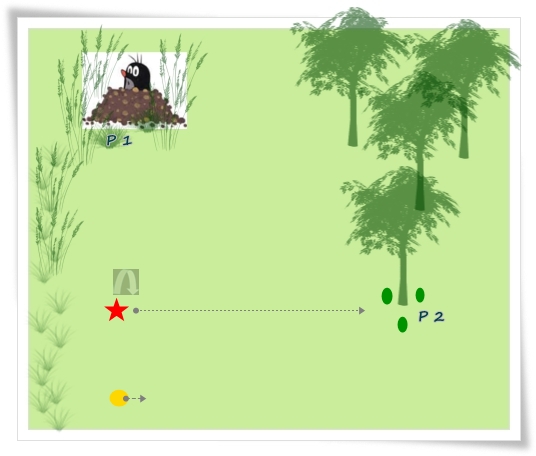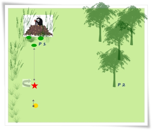 Nachdem ich sie zwei Mal „back“ geschickt hatte, zeigte ich ihr ein Dummy und ging den geraden Weg (90°) in Richtung P2. Dort tat ich so, als ob ich das Dummy auslegen würde, ging zu ihr zurück … und schickte sie „back“. Kein Problem 🙂
