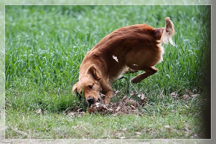 Was ich nicht bedacht hatte… Sie musste einen Waldweg überqueren (Treckerspuren von den Forstfahrzeugen). Dieser Übergang zog sie rechts vom direkten Weg ab. Aber nur ganz kurz, sie nahm Wind und hatte ihr Dummy ratzfatz im Fang und war auf dem Rückweg!