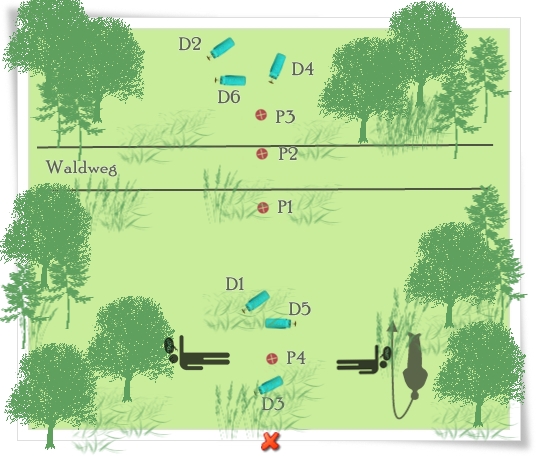 Mein Werfer bezog eine etwas verdeckte Position und wir stellten uns bei P1 auf. Von dort beobachteten wir die Markierung D1 die dann reingeholt wurde.