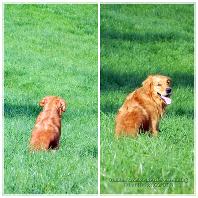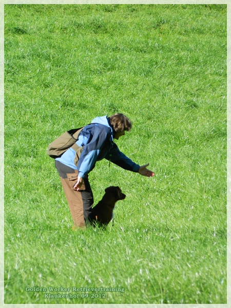 Wir arbeiteten uns fast über die ganze Wiese. Die Hunde arbeiteten in die Sonne. Wir drehten und sie mussten schlechtsichtige Markierungen in den Schatten arbeiten. Es zeigte sich, dass der einzige Mensch der wirklich gut markieren kann … wen wunderts Geli war. Man hab ich mich oft verschätzt… da habe ich eindeutig noch mehr Trainingsbedarf als mein Fienchen!