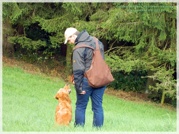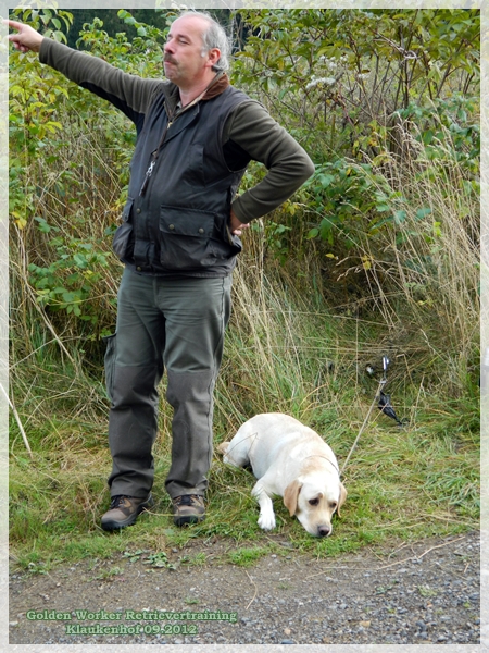 So, also Gladis und Fiene wechselten sich ab. Sie hatten beide super markiert und bis auf einen kleinen Anstandsbesuch beim Helfer war ich mit Fiene super zufrieden. Aber schließlich stand ja da auch ihr Herrchen im Wald… dem muss man ja auch mal stolz ein Dummy zeigen.