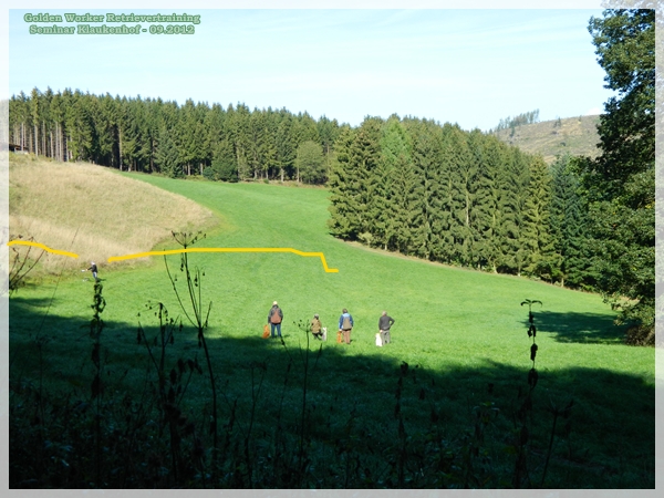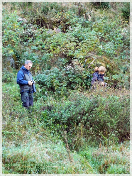 eine fiel in diesen üblen Bewuchs. Hohes Gras das scheinbar die Dummys „verschluckte“. Es war für die Hunde sehr schwer sie dort zu finden und die ander auf die platte Wiese.