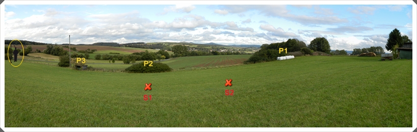 Zum Abschluß bezog der Helfer Position an einem neuen Startpunkt. Ich schickt Fiene auf P1 und vom Helferlein wurden in dieser Zeit zwei Dummys an den unbekannten Punkt P3 gelegt. Diese lagen auch in höherem Gras so dass sie sie auch nicht direkt sehen konnte.