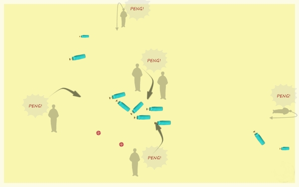 Die Grafik sieht etwas wirr aus aber die Aufgabe war wirklich klasse. Die Teams stehen am Startpunkt und sind „umzingelt“ von Werfern und Schützen. Direkt vor den Teams (ca. 25 Meter) und einige Meter schräg hinter den Teams und 2 Werfer/Schützen oben auf dem Hang des Kraters. Nun fängt es an rund um uns herum abwechselnd zu Schießen und es fallen insgesamt 10 Dummys. Mal eins vor uns, mal eins hoch in den Hang … wieder eins vor uns dann rechts eins unten in den Hang und so weiter!