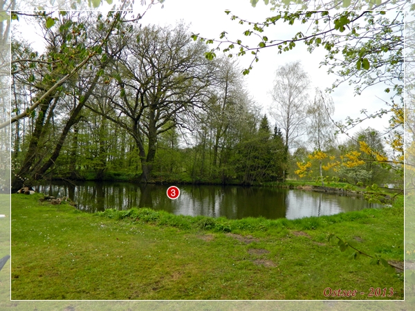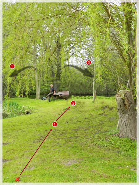 An Punkt 2 (siehe Bild 1) stehent sehen die beiden Teams eine Doppelmarkierung (kurz – lang) fallen. Hund 1 dreht sich um 180° um auf ein Halbblind in dem kleineren der Teiche eingewiesen zu werden.