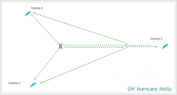 Drehen, weiter zum Voranpunkt 2 und ich lege die Dummys 3 und 4 aus. Wir drehen und gehen auf geradem Weg zurück zum späteren Startpunkt.