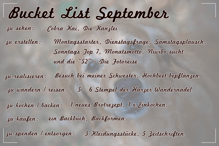 Die üblichen Verdächtigen – Montagsstarter, Dienstagsfrage, Samstagsplausch, Sonntags Top 7, Monatsmotto (noch nicht bekannt), Niwibo sucht … alles aus dem Herbstgarten und die „52“ – Die Fotoreise
