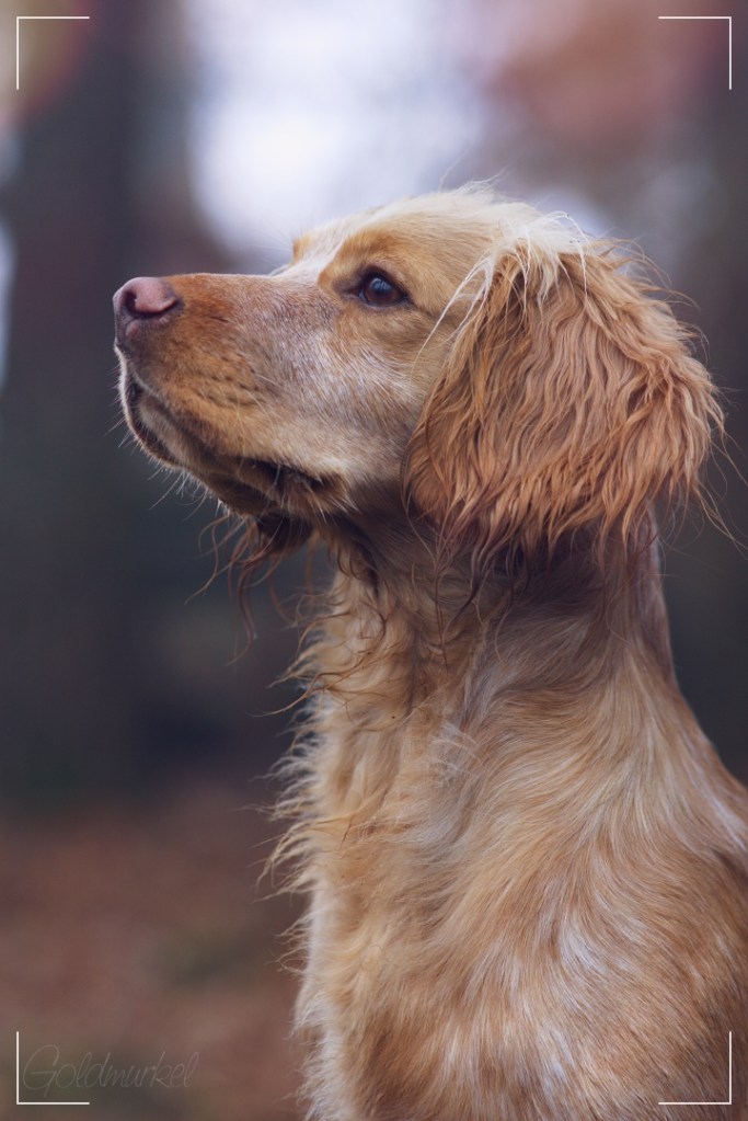 Wenn wir uns aber im Training befinden, dann sollen sie eng an meinem linken Bein laufen. Sie sollen aufmerksam sein und die Umwelt beobachten, damit sie sehen, wenn jemand ein Dummy wirft. Auch wenn es sehr aufregend wird, sollen sie ruhig bleiben und sich an mir orientieren. Sie sollen nicht vorprellen oder hibbeln.