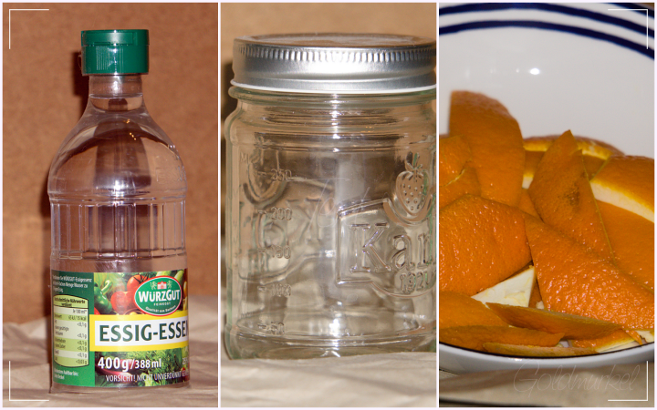 Mehr braucht es nicht. Ein leeres Marmeladenglas, Essig-Essenz und eben Orangenschalen. Diese schichtet man in das Glas und gießt dann den Essig darüber, bis diese bedeckt sind.