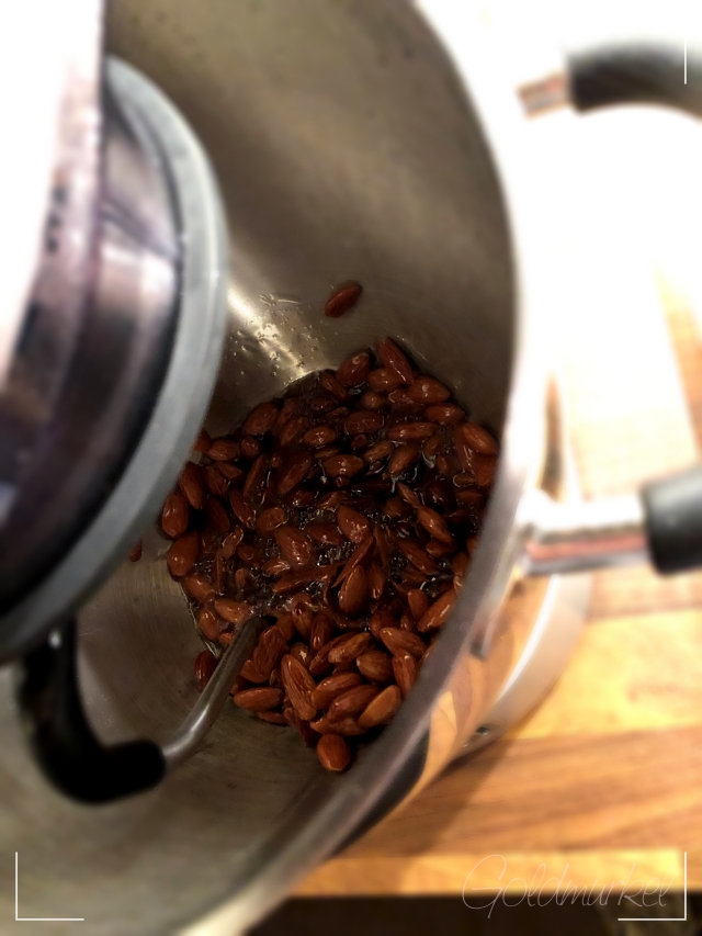 Den Rest macht die Küchenmaschine. Mandeln unter Rühren so lange „kochen“, bis das Zuckerwasser verkocht ist und die Mandeln „krümelig“ und „weiß“ werden. Dann die Temperatur auf 180° hochdrehen