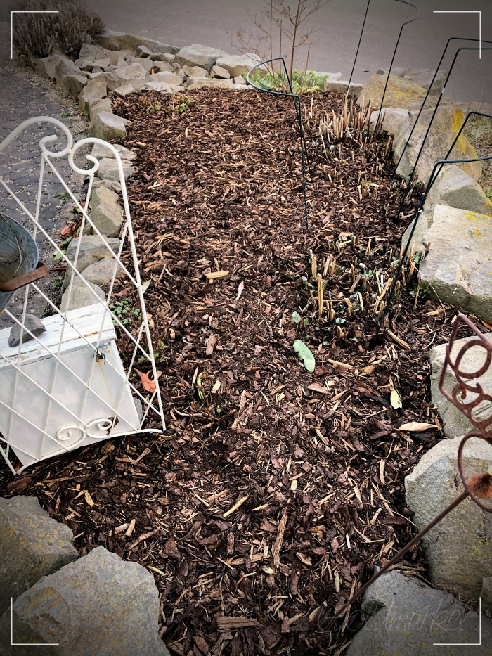 Im Zuge von jäten und mulchen hat das Pflanzgefäß am Hauseingang noch ein bisschen Frühling gesponsert bekommen.