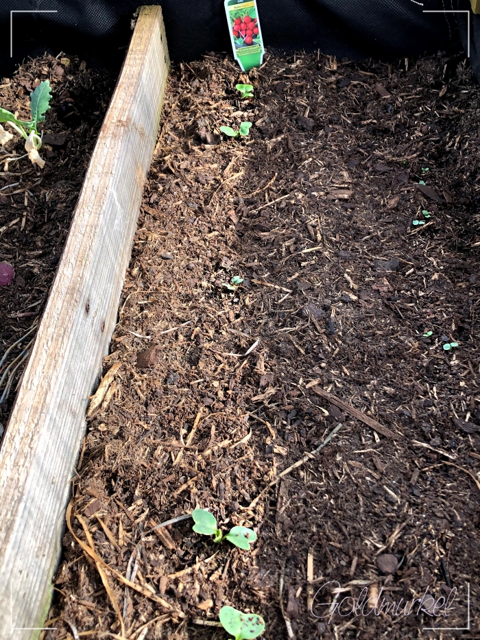 Ausgesät wurden Radieschen und Baby-Spinat – da schauen schon die ersten grünen Blattspitzen vorsichtig aus der Erde.