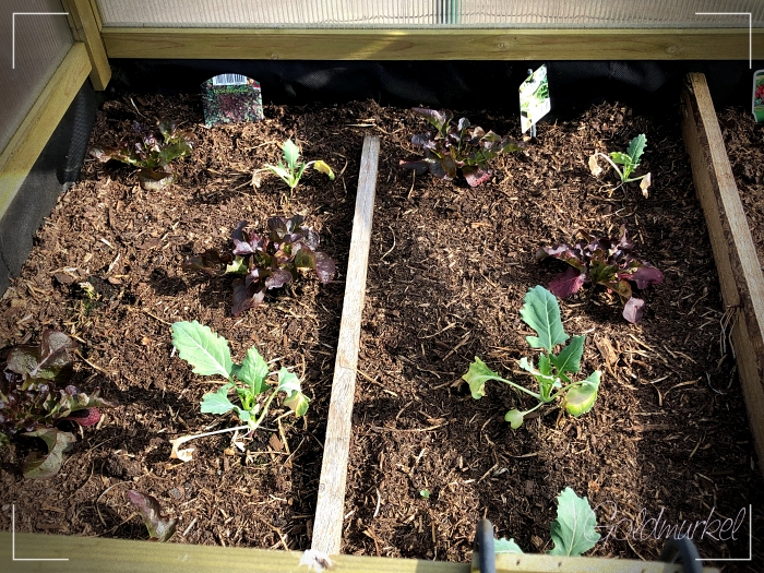 Im Hochbeet wachsen die ersten Salate, Kohlrabi. Die ersten Pflänzchen habe ich gekauft, damit es nicht so lange dauert, bis was etwas wächst.