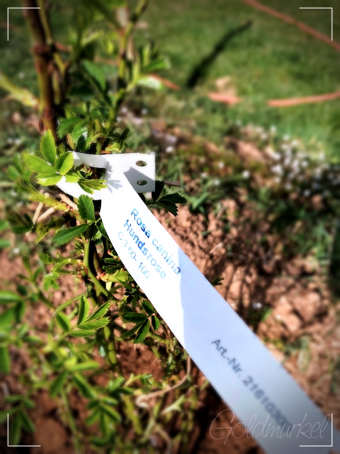 Für die Hecke hatte ich Pflanzen gewählt, die Bienen, Schmetterlingen und Vögeln Nahrung geben. Pfaffenhütchen, Schlehe, Weißdorn, Eberesche, Holunder – all das darf jetzt gemeinsam mit einer Kartoffel- und einer Hundsrose zu einer schönen Hecke wachsen.