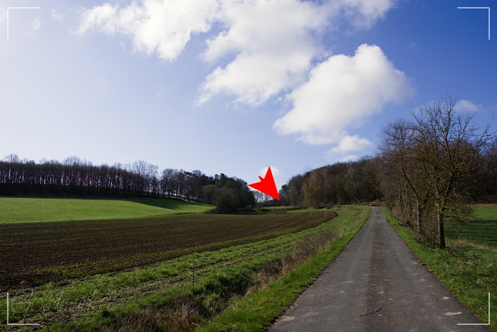 Da wo der Pfeil hinzeigt, standen Rehe, die mich wirklich recht dich herankommen ließen, bis sie dann in dem Wäldchen verschwanden. Überhaupt konnte ich mich über Rehe, Störche, einen Feldhasen, nochmal Rehe und ein Alpaka freuen. Letzteres war anscheinend schlecht frisiert und versteckte sich hinter seinem Unterstand. Ein Foto machen war unmöglich!