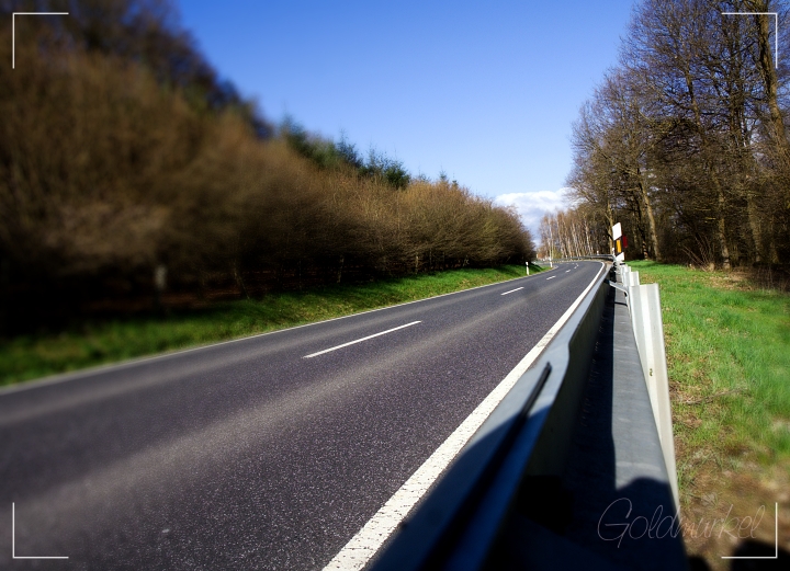 Leider führt der Wanderweg jetzt ein Stück direkt an der Landstraße entlang. Man folgt einem Trampelpfad, der neben der Leitplanke verläuft.