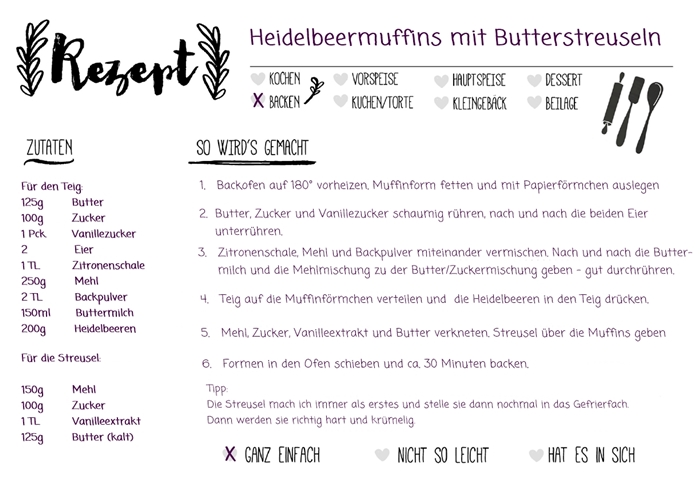Ich liiiieeebe Heidelbeermuffins – überhaupt mag ich Muffins – sie sind schnell gemacht, eine gute Portionsgröße, sie lassen sich gut einfrieren und sie sind einfach mega lecker. Das Rezept könnt ihr euch HIER herunterladen.
