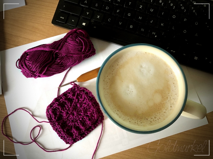 So sieht der Samstagmorgen auf meinem Schreibtisch aus. Kaffee ist Pflicht, Tastatur auch (ich kann auf dem Tablett nicht schreiben) und das Häkelprojekt wächst immer um ein paar Maschen.
