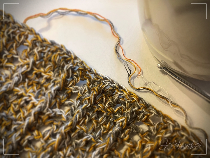 Das neue „Fareth“ wächst ganz langsam. Gestern bin ich beim ersten Knötchen angekommen. Das bedeutet, dass einer der vier dünnen Fäden jetzt die Farbe wechselt.