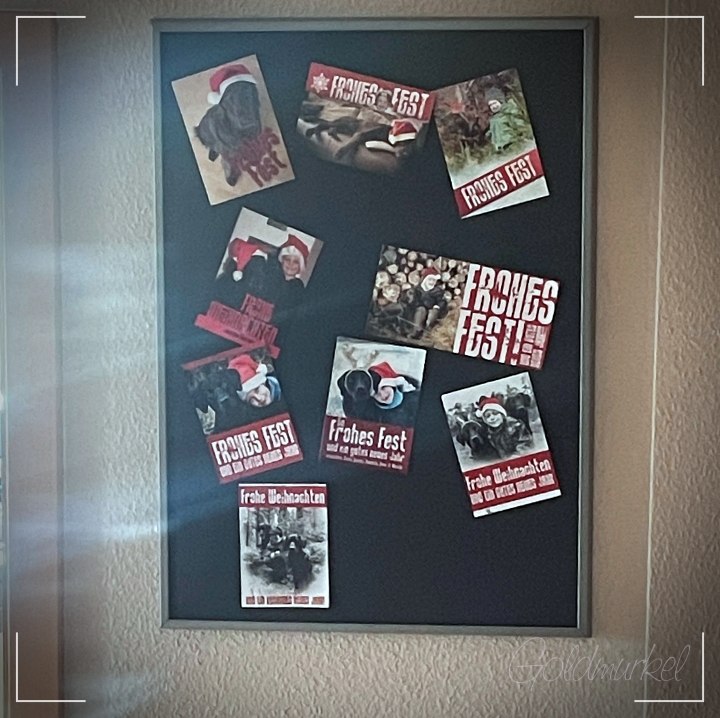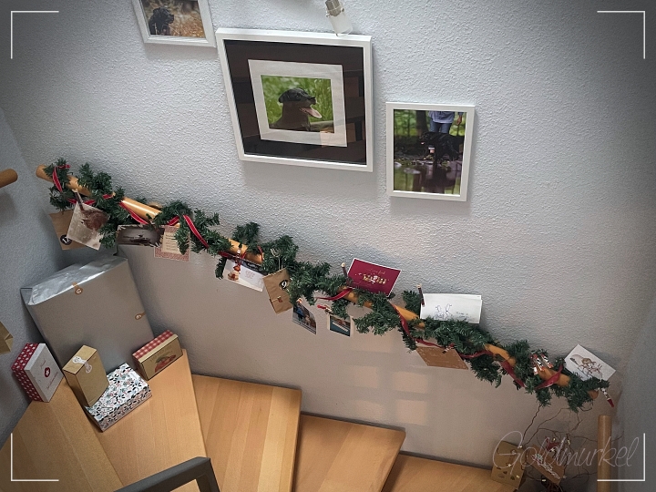 Ungefähr zur selben Zeit wird der Karton mit der Tannengirlande vom Dachboden gezerrt und dieselbige an das Geländer gedängelt, um meine Kartenschätze der Vergangenheit dort zu befestigen und natürlich auch die von diesem Jahr.
