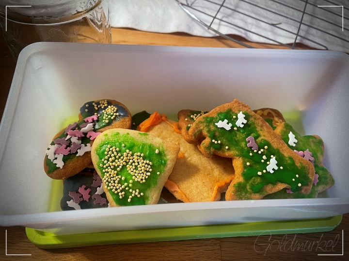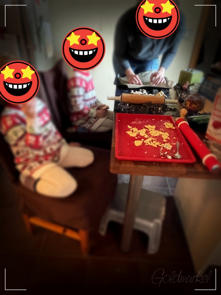 Ein Erlebnis der besonderen Art war es, mit den Nichten zu backen. Spaß hat es gemacht, aber ich bin immer ein wenig traurig, dass ich für solche „Aktionen“ fast immer mit Kopfschmerzen „bestraft“ werde. Egal… „Spaß kost!“ so hieß das früher, wenn man nach einer durchzechten Nacht völlig fertig an der Arbeit rumgestolpert ist.