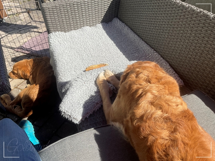 Hetty liegt neben mir auf dem “Gartensofa“, Mac zu meinen Füßen. Sie genießt die warmen Sonnenstrahlen und das Kerlchen nagt an seinem Kaustreifen. Fiene hat sich in den Schatten verzogen und schläft tief und fest.