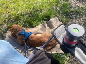 Was für ein Monat. Mac war mit im Training. Er liegt auf seinem Deckchen, während Katharina in einiger Entfernung etwas mit Jesper arbeitet. Das hat auf jeden Fall super geklappt. Im Anschluss haben wir ein bisschen Rückruf-Training gemacht.