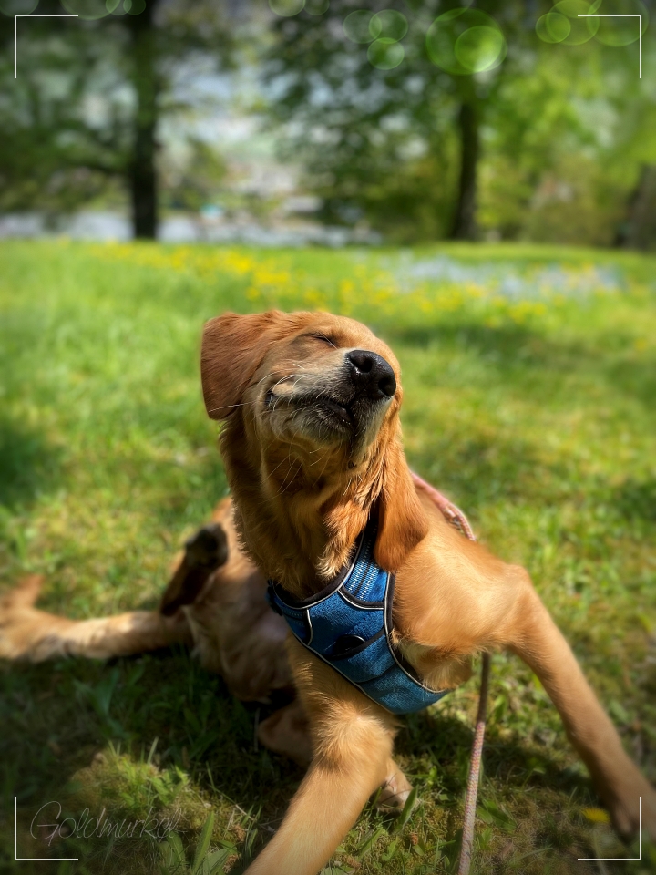 Was steht noch so auf dem Plan: Leinenführigkeit, Rückruf, die Garten-Benimmregeln (kein Bellen am Gartenzaun bei den Nachbarn, keine Tiefbauarbeiten, nicht über Beete rennen, sondern „außenrumm“). Das ist schon ganz schön viel für so einen kleinen Hundemann.
