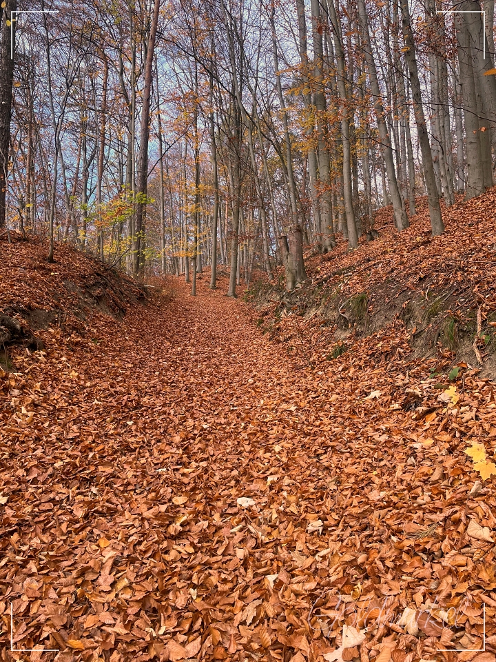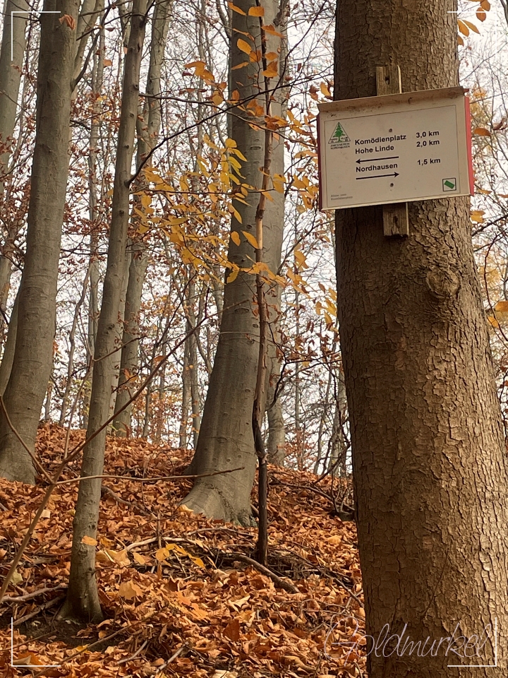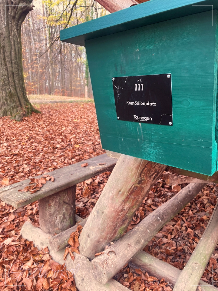 Der Weg führte uns weiter durch den herbstlichen Wald und schon bald kam der Komödienplatz in Sicht. Etwas irritiert stellte ich fest, dass dort keiner der mir bekannten Kästen der Harzer Wandernadel hing, sondern einer der „Touringen – Stempelstellen“. Nun gut, kein weiterer Stempel für mich auf dem Weg zur Wanderkaiserin, aber dennoch eine schöne Runde.