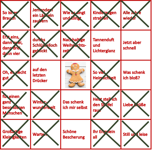 Endlich kann ich wieder ein Kreuzchen machen. „Alle Jahre wieder“ beschweren wir die Tiere im Wald. Danke an Ingrid, Maika und Starky, die sich das Weihnachtsfreuden 2022 Bingo ausgedacht haben.