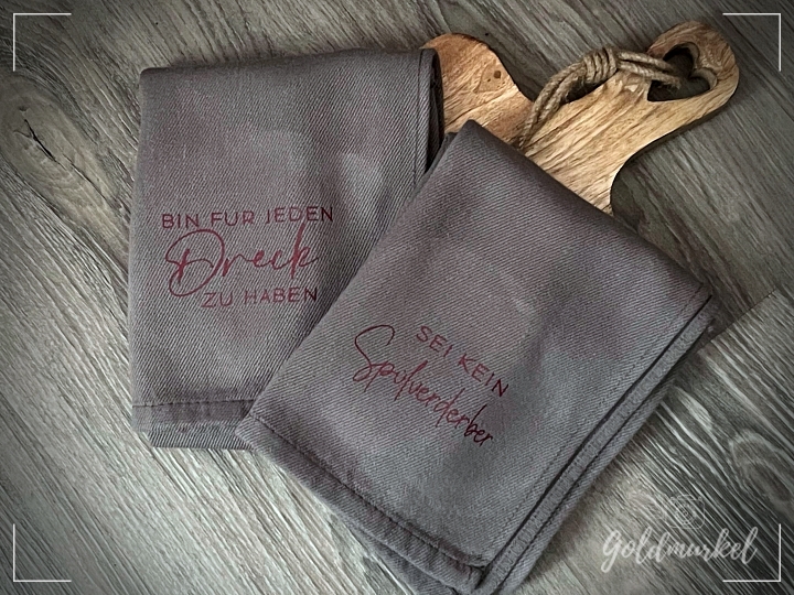 Ich habe mich für Geschirrtücher entschieden. Unifarbene Baumwolltücher mit einem lustigen Spruch.