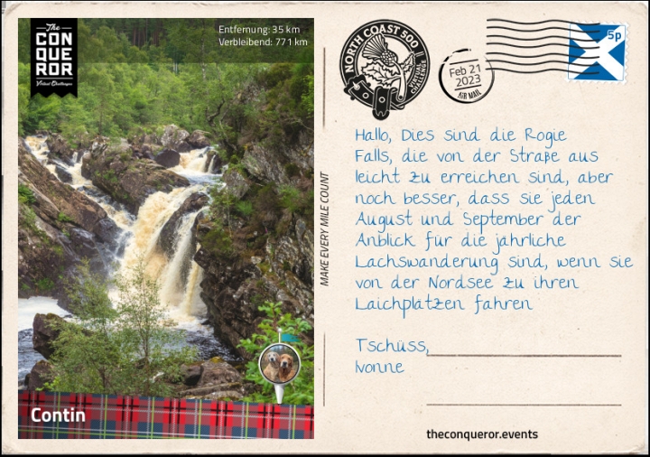 Contin ist ein kleines Dorf mit etwa 670 Einwohnern in der NĂ€he des Flusses Black Water. Nördlich des Dorfes, abseits der HauptstraĂe, fĂŒhrt eine kurze Wanderung durch WĂ€lder zu den Rogie Falls, die 9 m (30 FĂŒĂe) in den Fluss Black Water stĂŒrzen. Es ist eine Hangkaskade, die ĂŒber mehrere Schichten groĂer Felsbrocken flieĂt, die am besten von der nah gelegenen HĂ€ngebrĂŒcke aus zu sehen ist.Â