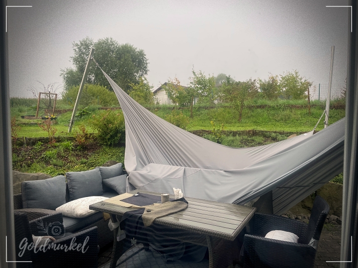 Inzwischen haben der Gatte und ich den Mast wieder gerade gestellt. Den Hohlraum mit Blitzzement aufgefüllt und einen neuen Haken am Dachbalken verschraubt. So saßen wir heute bereits wieder unter unserem Sonnensegel und konnten den Tag genießen.