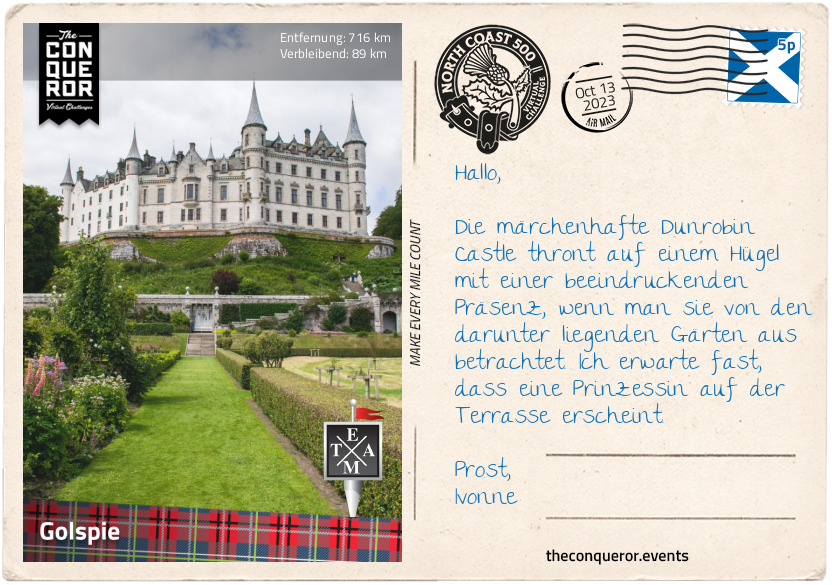 Golspie ist ein Küstendorf an der Nordseeküste. Es wird vom nahe gelegenen Ben Bhraggie, einem Hügel direkt hinter dem Dorf, überschattet. Der Hügel ist 397 m (1302Füße) hoch und ganz oben steht ein 30 m (100 Füße) hohes Denkmal des ersten Herzogs von Sutherland. Das Denkmal wurde 1837 errichtet und thront weithin sichtbar auf dem Hügel. Das Dorf hat einen langen Sandstrand, der wie ein guter Ort schien, um innezuhalten und den Meerblick zu genießen.