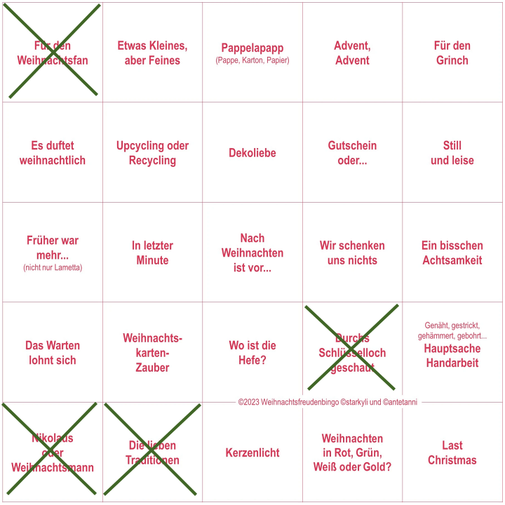 Durch meine Posteinleitung kann ich heute ein weiteres Kreuzchen auf dem Weihnachtsfreuden 2023 Bingo machen. Anni und Starky haben sich für diese schöne Aktion dieses Jahr die Felder ausgedacht.
