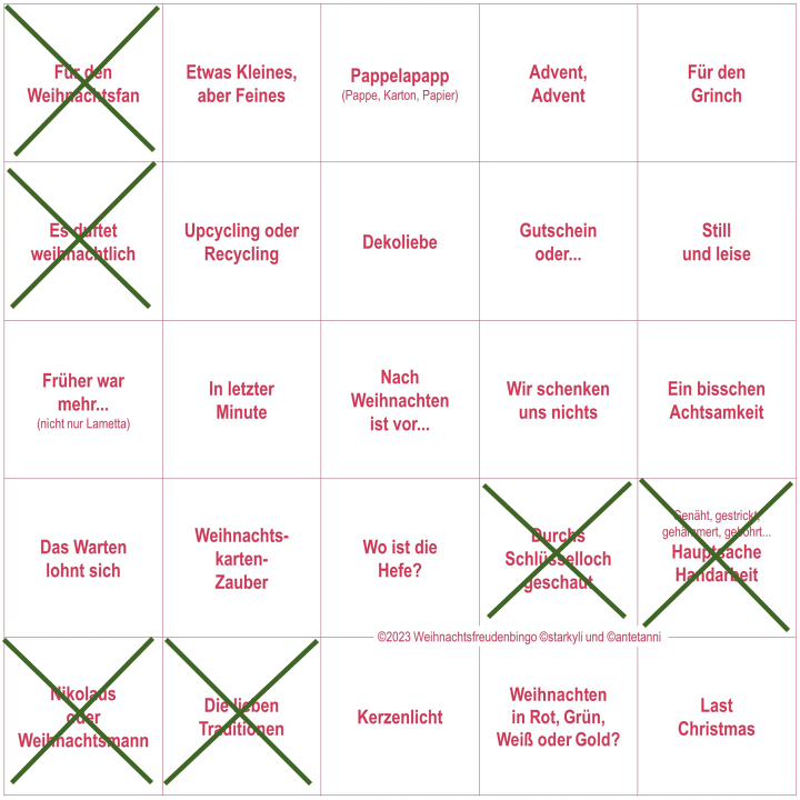 Da fällt mir ein, das ist doch wieder ein Kreuz auf der Bingokarte. „Es duftet weihnachtlich“ ist schon das sechste Feld. Die Teilnahme am Weihnachtsfreuden 2023 Bingo läuft gut.