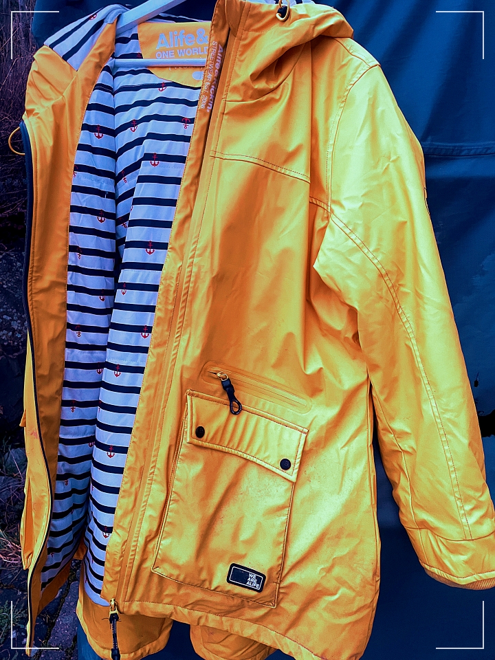 Dein Lieblingsoutfit dieser Woche? Naja, „Lieblingsoutfit“ trifft es nicht so ganz… Obwohl, den Regenmantel mag ich schon sehr gerne. Es ist kein klassischer Friesennerz. Dieser hier ist ganz weich und auch kuschelig warm. Einzig die Kapuze ist viel zu groß. Was sich die Designer dabei gedacht haben, ist mir ein Rätsel.